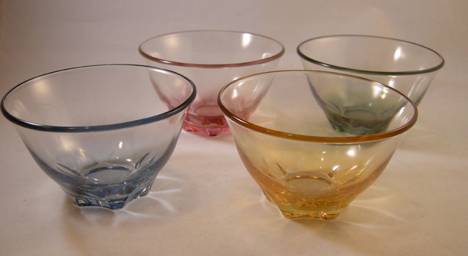 De kleuren van het glas worden verkregen door er verschillende metaaloxiden toe te voegen: ijzer – bruin, chroom – groen, kobalt- blauw, selenium – rood, uraan – geel/groen en ijzer en koolstof dat zwart oplevert. Bij het oudere persglas is dikwijls de beschikbaarheid van bepaalde grondstoffen en de onzuivere toevoeging van hoeveelheden de oorzaak van kleurverschillen. In landen met beperkte invoer, zoals dat in de (voormalige) Oostblok landen nogal eens voorkwam, kon de kleur wekelijks licht verschillen. Ook de mode van het moment was van invloed op de kleur die werd gemaakt. Zo kwamen de zwarte onder schotels eind 1950’s erg in zwang en weer iets later waren sets glas in vier of zes verschillende kleuren weer heel erg in de mode. Bekend is de toepassing die Tiffany voor glas bedacht, glas in loodachtige mozaïeken. In mijn verzameling heb ik wel wat voorbeelden van andere kleuren maar om de voorbeelden compleet te maken heb ik gezocht naar voorbeelden van anderen. Waar mogelijk geef ik de bron aan.